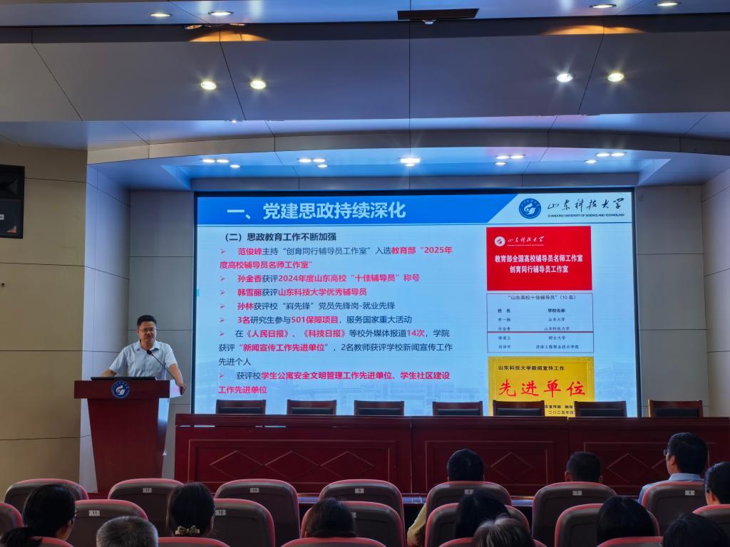 于J6-433报告厅召开2025年秋季学期全体教职工大会,全面总结上半年工作,部署新学期重点任务。会议由学院党委书记范俊峰主持。