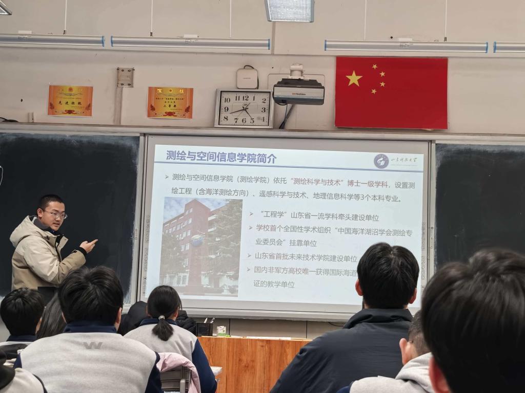回到阔别一年的高中母校,以山东科技大学“代言人”的身份站上讲台,望着台下那些与我当年一般憧憬又迷茫的面孔,一种难以言说的复杂情感油然而生。我的宣讲,是从高考后的志愿填报选择开始的——那是我第一次深入了解山东科技大学,第一次深入探索大学生活的点点滴滴。我告诉他们,大学之美,首先在于这份让你沉静下来的力量。当我讲到我们的测绘与空间信息学院,讲到地理信息科学如何用代码与数据重新描绘世界,将山川河流、城市街巷转化为可分析、可预测的数字模型时,我看到几个对科技感兴趣的同学眼睛亮了起来。我分享了自己如何从对专业名词感到陌生,到观摩学长老师一步步处理卫星影像,最终看到自己逐渐接触相关知识和技术、真正的参与其中。这种从理论到实践的踏实路径,正是山科赠予我的珍贵礼物。