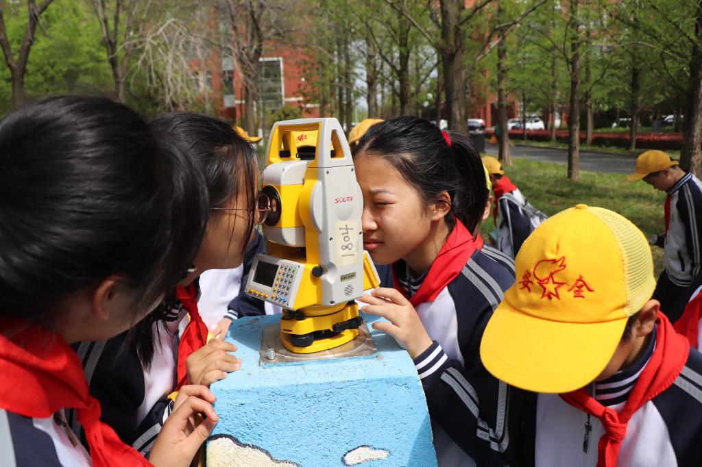 随后,实验中心主任刘凤英带领同学们前往标准化测量实验教学场地,详细讲解强制对中观测墩、测绘文化彩绘、国家控制点等专业设施的功能的同时,介绍了测绘文化的丰富内涵,并亲自指导同学们亲手操作全站仪,体验测距、测角的基本流程,让抽象的测绘知识变得可触可感,进一步激发了大家对科学探索的兴趣。