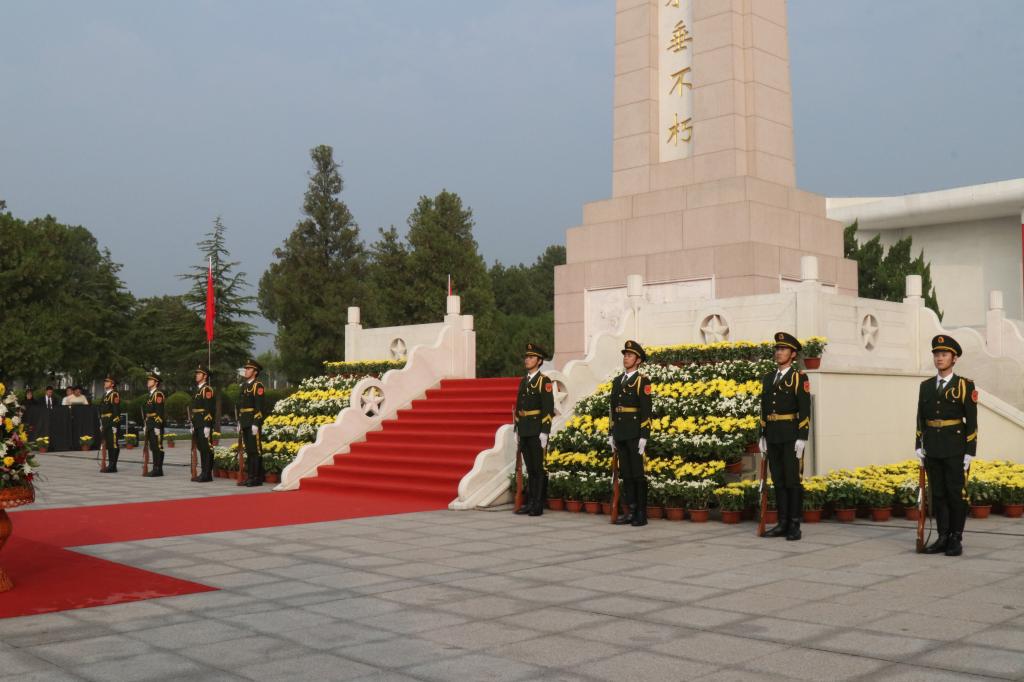 上午8时,仪式正式开始,礼兵就位。伴随着铿锵有力的步伐,国旗护卫队队员身着统一制服,手持礼宾枪,迈着标准正步从陵园入口行进至烈士纪念碑前。队员们身姿挺拔、目光坚定,步伐整齐划一,脚步声在肃静中回响,展现出新时代青年昂扬的精神面貌与对革命先烈的深切缅怀。
