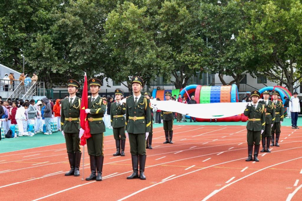 伴随着激昂的进行曲,国旗护卫队迈着铿锵有力的步伐,沿跑道庄严行进至升旗台。队员们动作标准、步调一致,全程姿态挺拔、目光坚定,充分展现出严谨的作风与昂扬的精神面貌。在庄严的国歌声中,升旗手奋力扬起五星红旗,全场人员行注目礼。在嘹亮的国歌声中,五星红旗缓缓升至旗杆顶端,在体育场上空迎风展开。